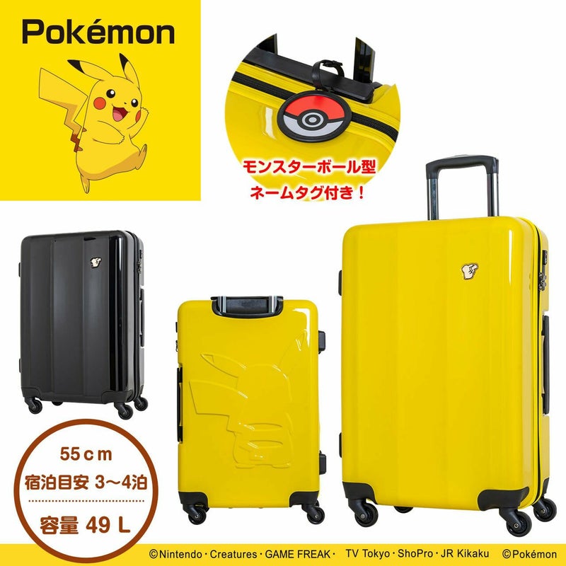 《商品の特徴》 シンプルな前面とは打って変わり、背面ボディには大きくピカチュウの後ろ姿を配置。 内側の生地・ベルトもポケットモンスターの世界観に合わせ、ボールを意識したカラーリングに。 ポケモン好き・ピカチュウ好きにはたまらない、ビビッとくるキュートなデザインに仕上がりました。 モンスターボール型のネームタグ付き! 《旅行宿泊目安》 ・3~4泊 《商品の特徴》 ・前面にはワンポイントでゴールドのピカチュウプレート付き ・背面にはピカチュウが後ろを向いたボディーデザインがカワイイ!! ・内装はモンスターボールを連想させるカラーコンビネーション! 【サイズ】 ・サイズ(総外寸)cm : 62 × 41 × 25 総外寸三辺合計cm: 128 ・サイズ(外寸)cm : 55.5 × 38.5 × 25 ・サイズ(内寸)cm : 55 × 38 × 60 (斜め) ※総外寸 H (高さ) × W (幅) × D(奥行) は、ハンドルからキャスターまでの突起部を含んだサイズです。航空会社のサイズ基準はこの「総外寸」になります。 ※外寸 H (高さ) × W (幅) × D(奥行) は、ハンドル、キャスター等の突起部を除いたサイズ表記です。 ※内寸 H (高さ) × W (幅) × D(斜め) は、インナー(内装)の、サイズ表記です。 【重さ、容量】 ・重さ(約) : 3.3 kg ・容量(約) : 49 L 【素材】 ・ポリカーボネイト&ABS樹脂 【ロックタイプ】 ・TRAVEL SENTRY シリンダー 【キャリーバー高さ調整】 ・3段階 【キャスター種類】 ・シングル-50mm 【カラーバリエーション】 ・ブラック ・イエロー