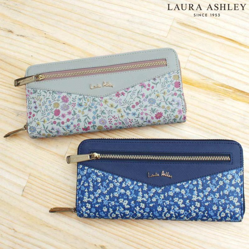 可愛い小花柄のローラ・アシュレイのラウンドファスナー型の長財布。 金のプレートにLaura Ashleyのロゴが刻印されていて上品な仕上がり。 お札入れが2つあり、レシートやクーポン券などの整理に便利。 カード入れも12個あり、小銭入れも大きくて見やすく、 スリムなのに大容量で収納できます。