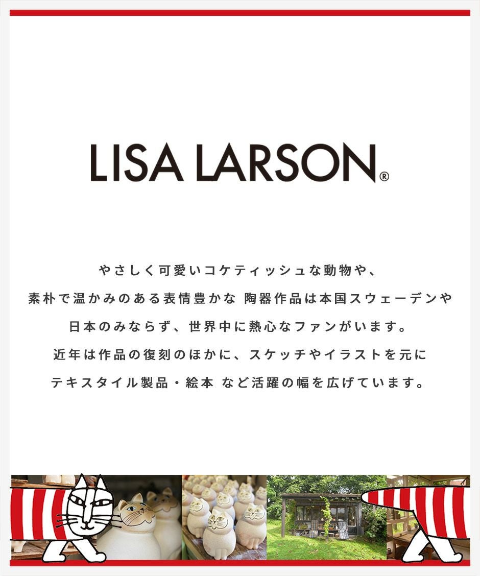 やさしく可愛いコケティッシュな動物や、素朴で温かみのある表情豊かな 陶器作品は本国スウェーデンや日本のみならず、世界中に熱心なリサラーソンのファンがいます。近年は作品の復刻のほかに、スケッチやイラストを元にテキスタイル製品・絵本 など活躍の幅を広げています。