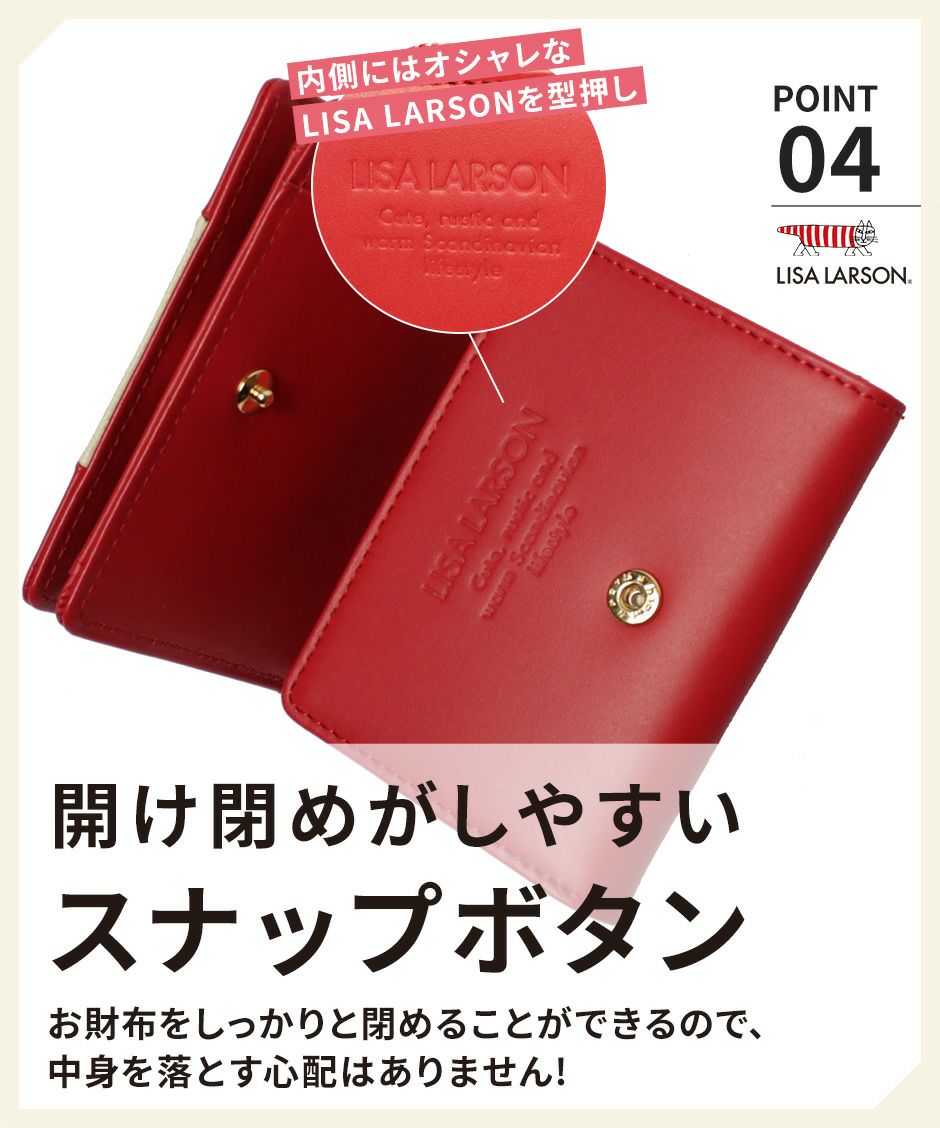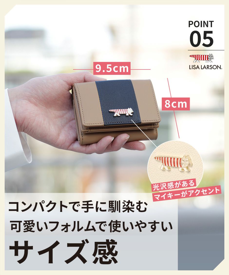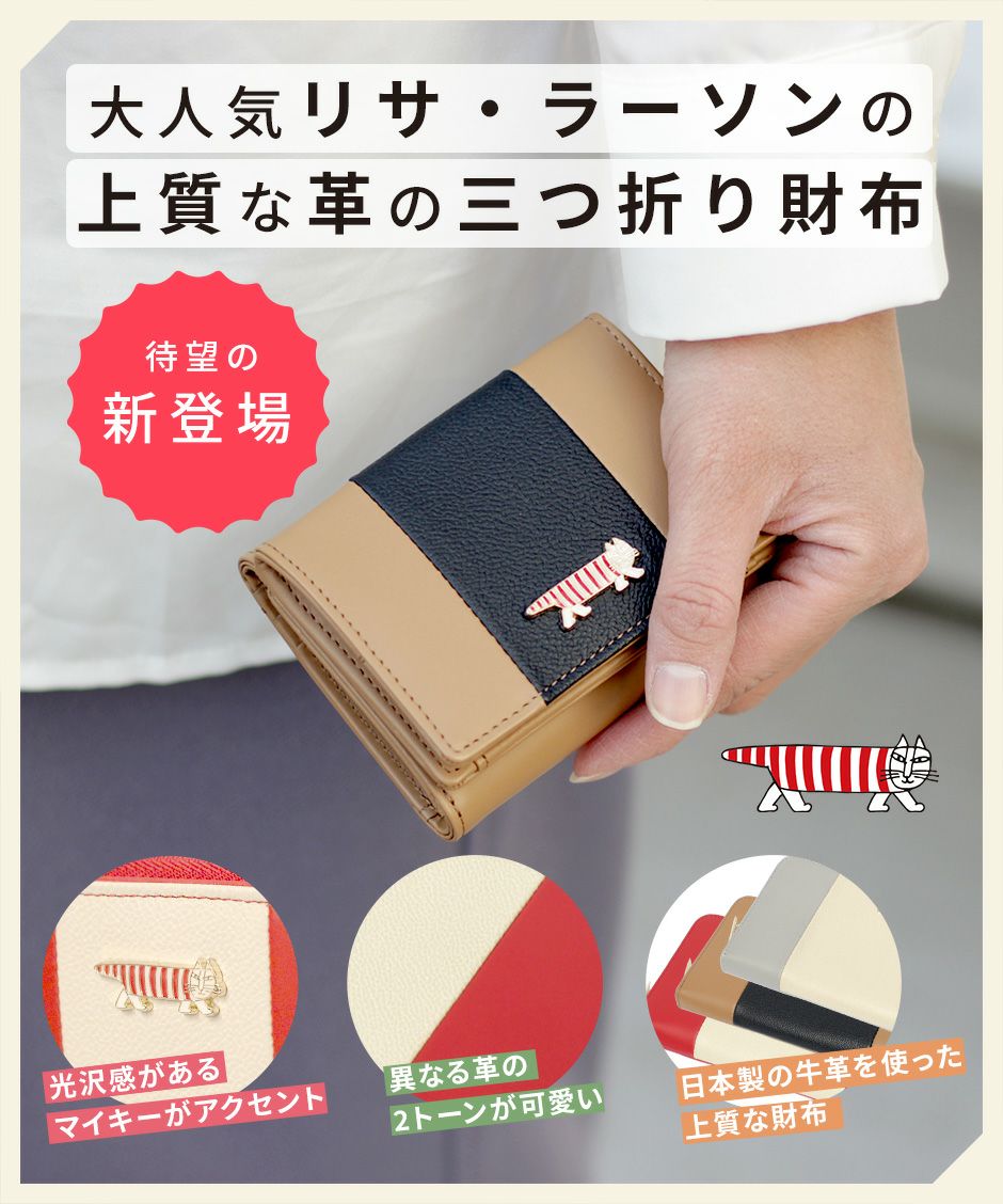 世界中で愛される北欧ブランド“LISA LARSON(リサ・ラーソン)”から、シンプル・エレガントな大人のお財布シリーズが新登場。 上質な牛革を使用し、プレーン×シボ型押しの2種類のレザーでバイカラーに仕上げました。 ちょこんと乗った“マイキー”のプレートは、一点ずつハンドメイドにより仕上げた細やかな作り。 きらりと輝くチャームプレートが、立体的で可愛らしいアクセントになっています。 LTLY-04は手のひらサイズ・三つ折りタイプのミニ財布。スナップ式の小銭入れや、札入れ、カードポケットなど小さくてもしっかりと収納が可能です。 リサ・ラーソンのロゴ入り化粧箱付きで、プレゼントにもおすすめです。