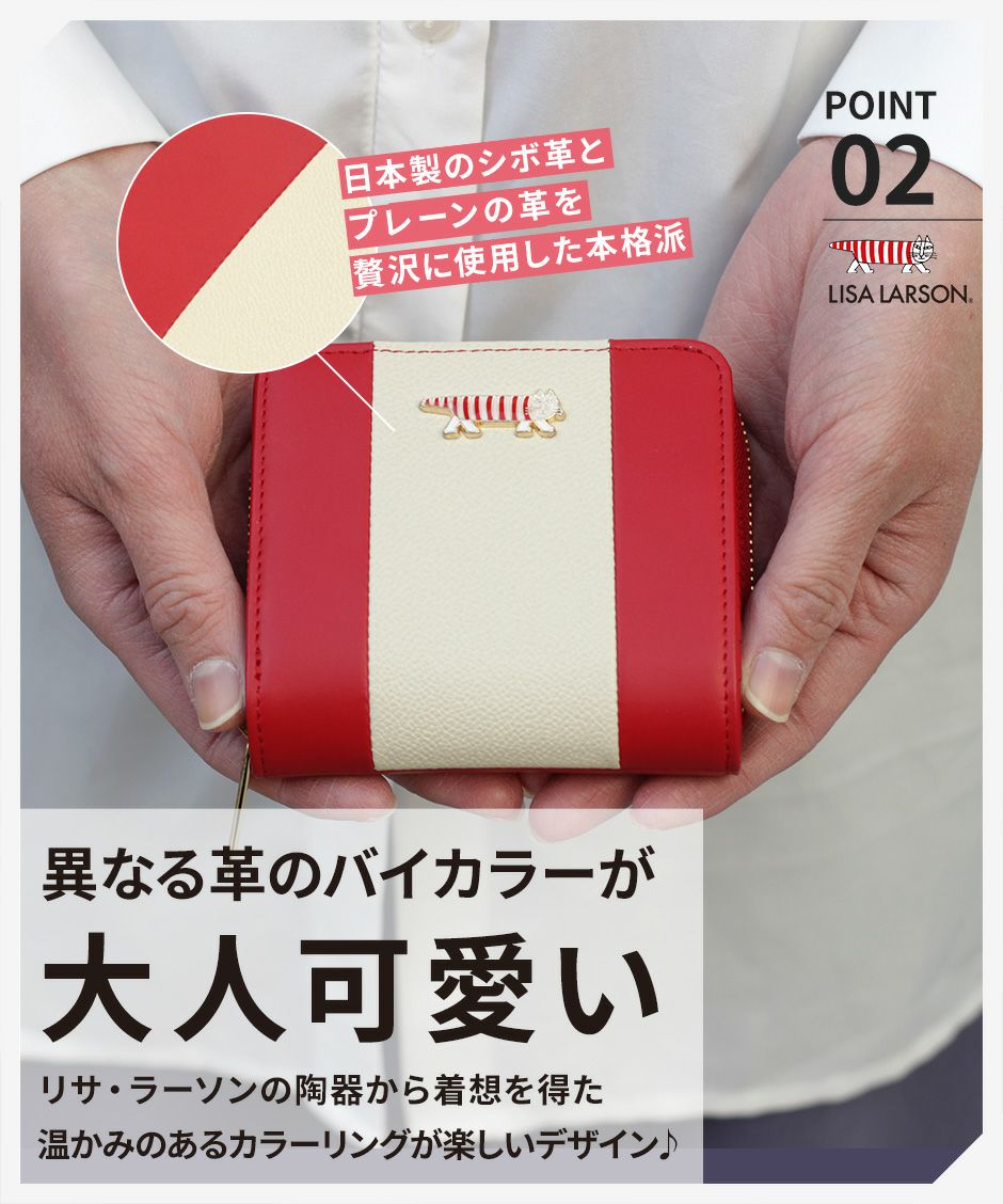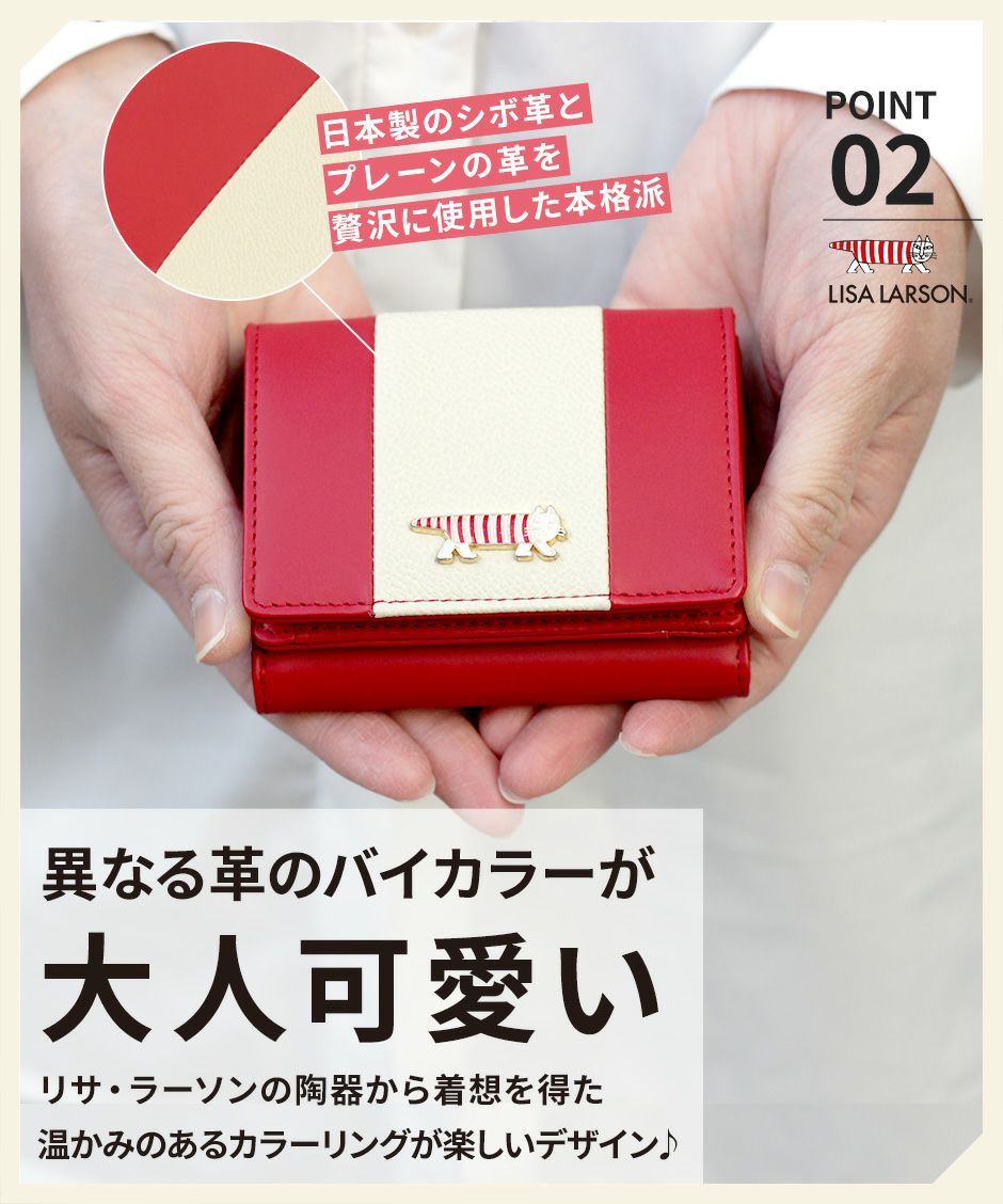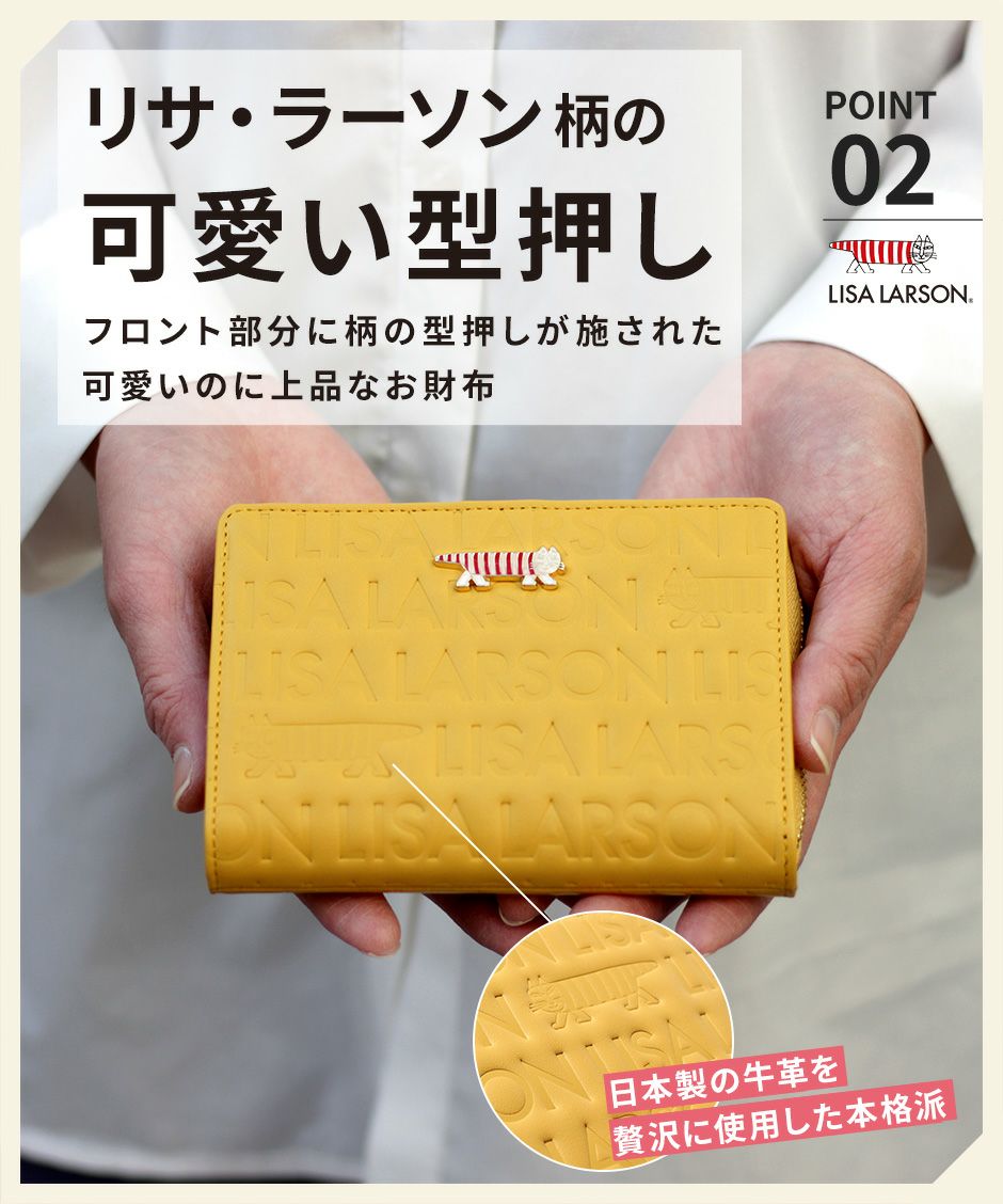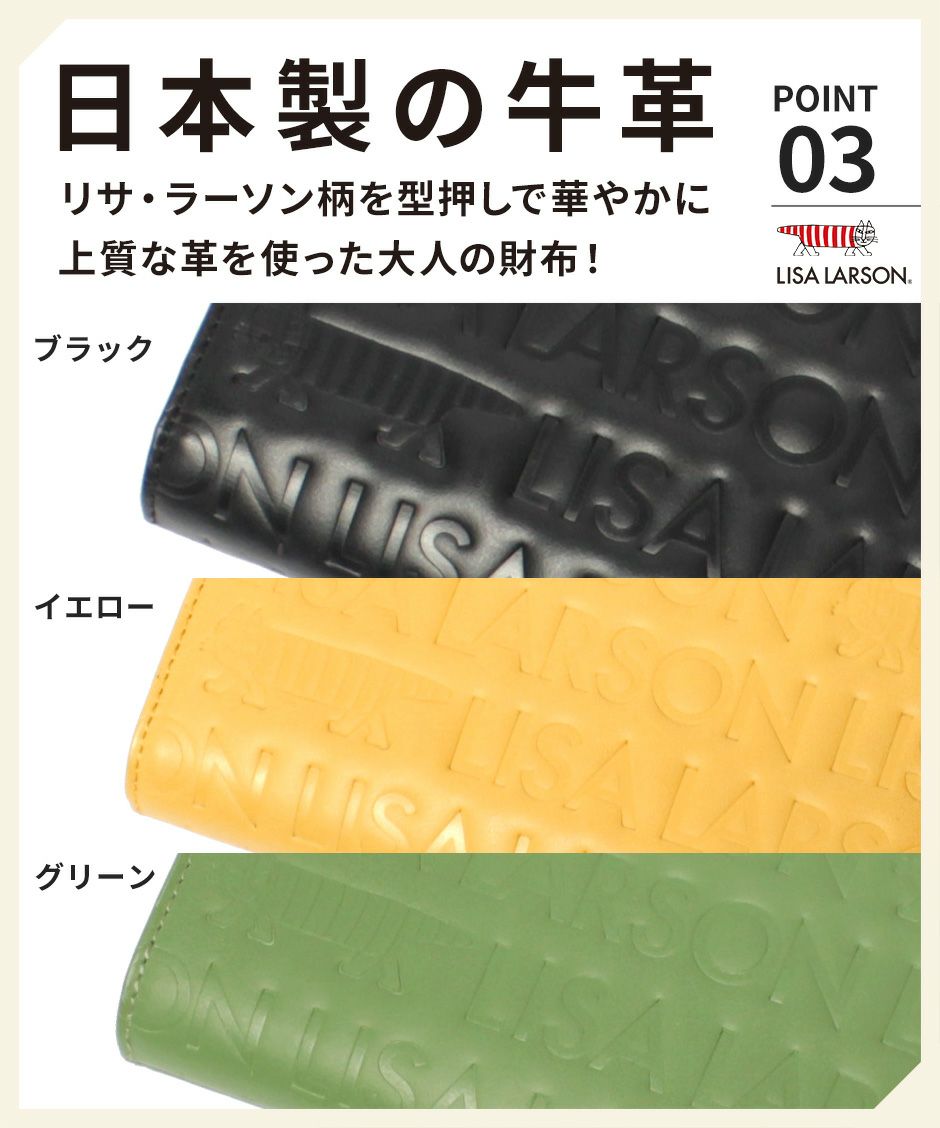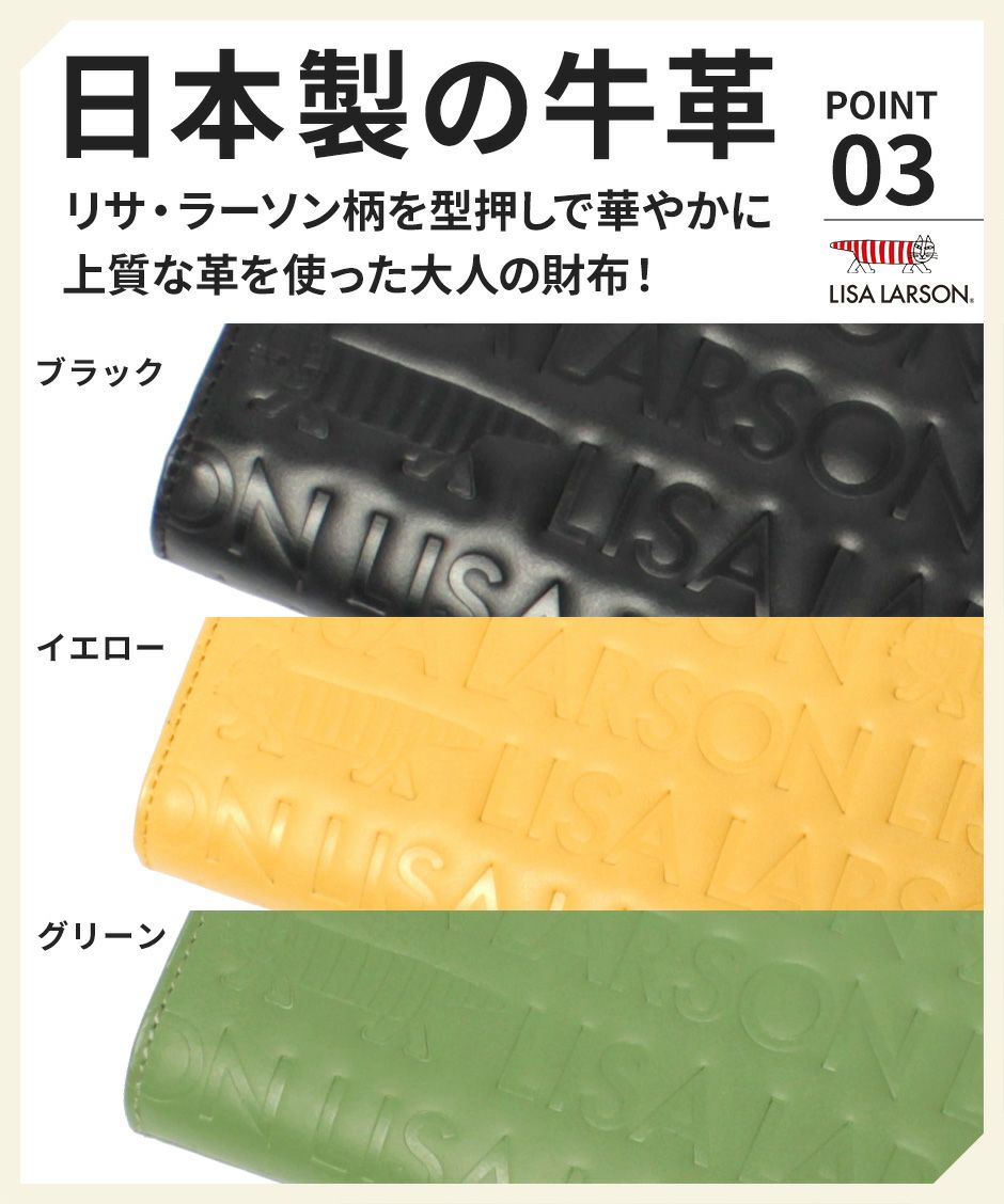プレーン×シボ型押しの2種類の牛革を組み合わせ、バイカラーにデザインや手触りの良い上質な牛革を使用。型押しが綺麗なリサラーソンのお財布をご用意しています。