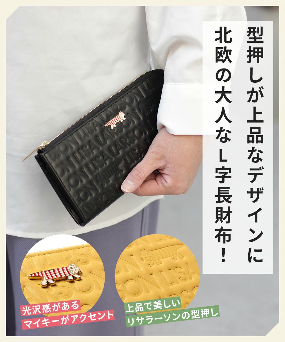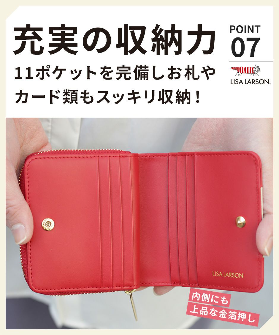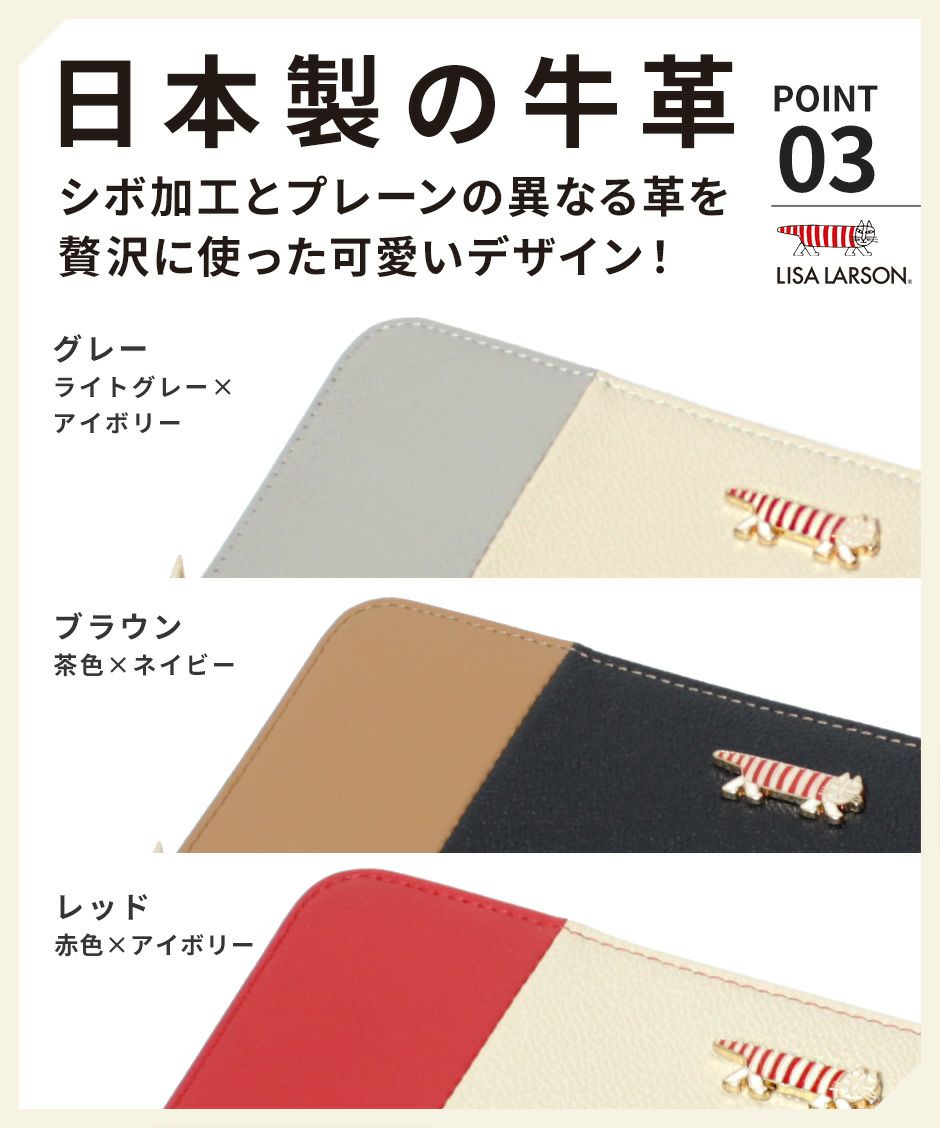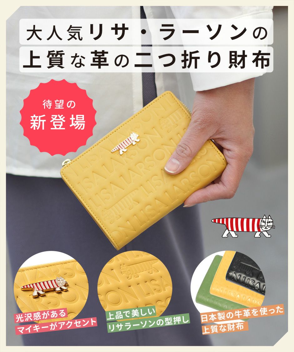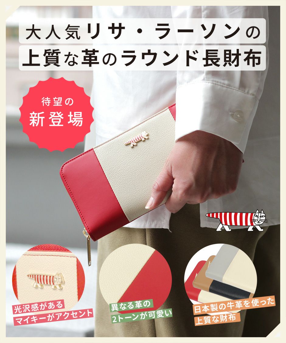 プレーン×シボ型押しの2種類の牛革を組み合わせ、バイカラーにデザインや手触りの良い上質な牛革を使用。型押しが綺麗なリサラーソンのお財布をご用意しています。