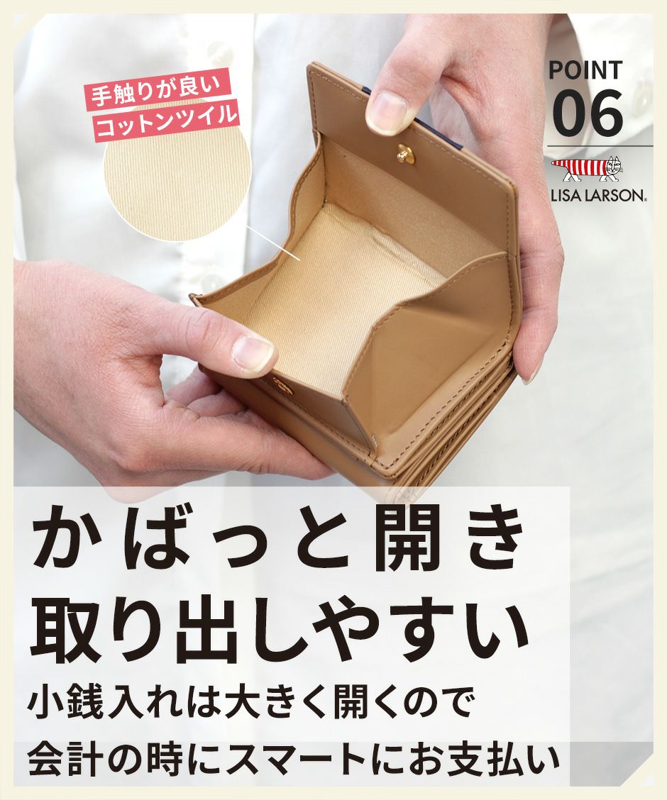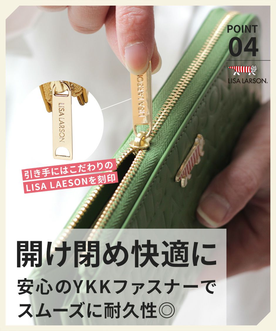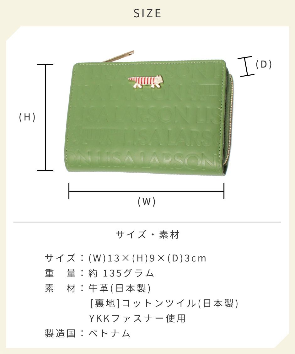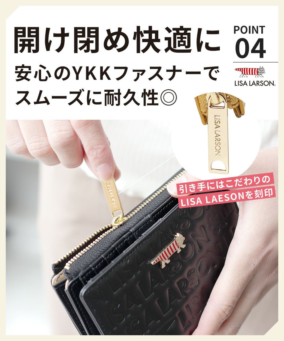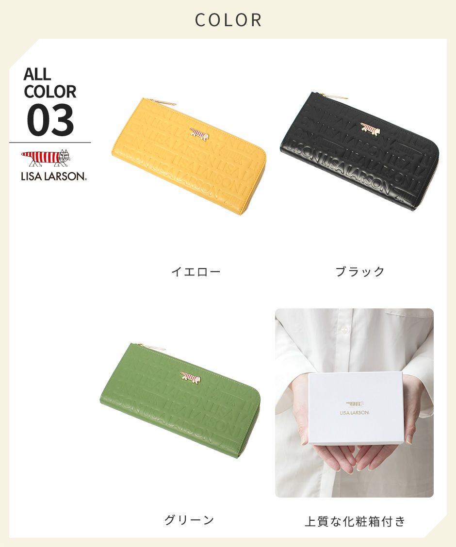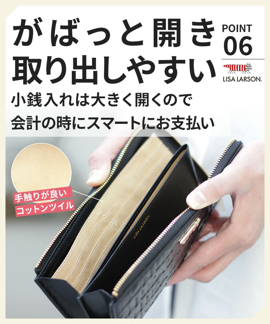 プレーン×シボ型押しの2種類の牛革を組み合わせ、バイカラーにデザインや手触りの良い上質な牛革を使用。型押しが綺麗なリサラーソンのお財布をご用意しています。