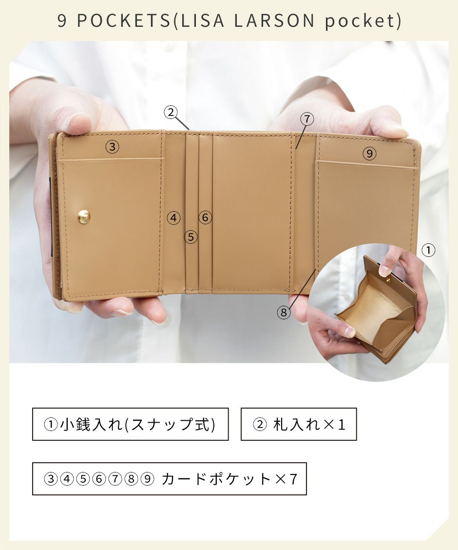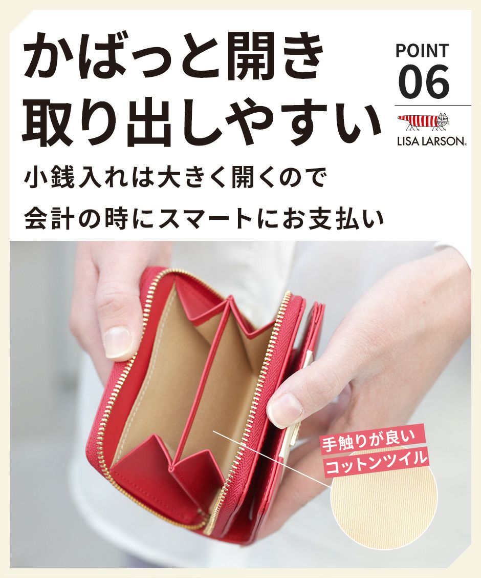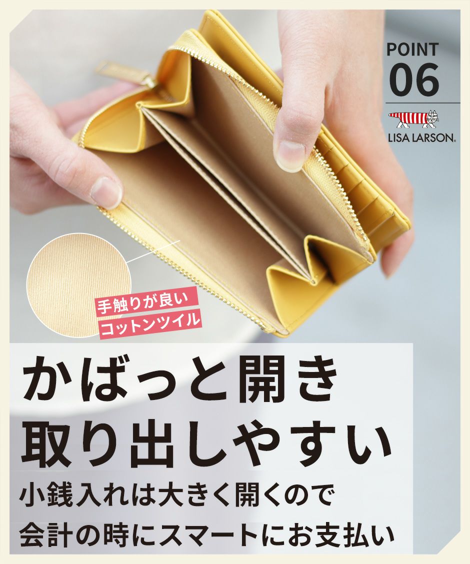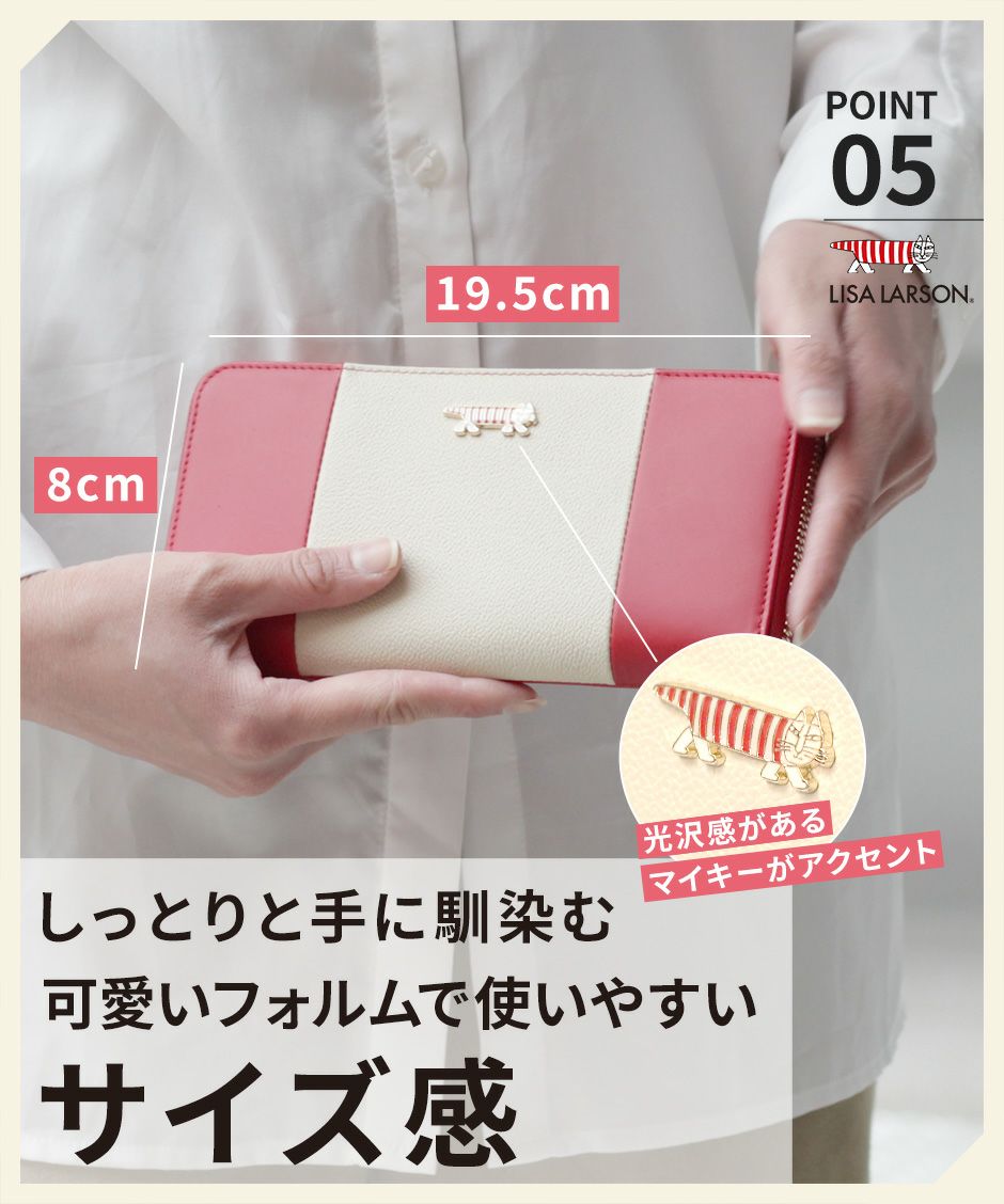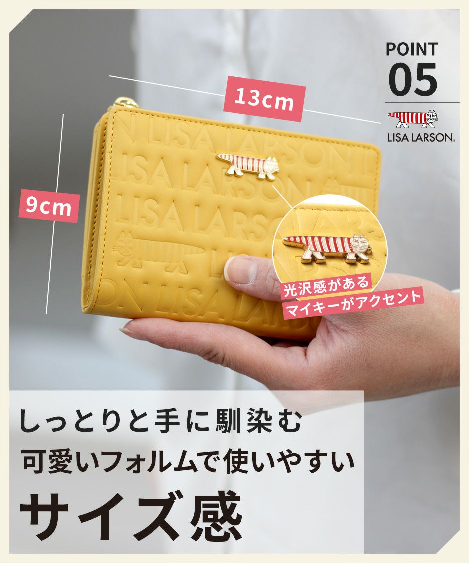 プレーン×シボ型押しの2種類の牛革を組み合わせ、バイカラーにデザインや手触りの良い上質な牛革を使用。型押しが綺麗なリサラーソンのお財布をご用意しています。