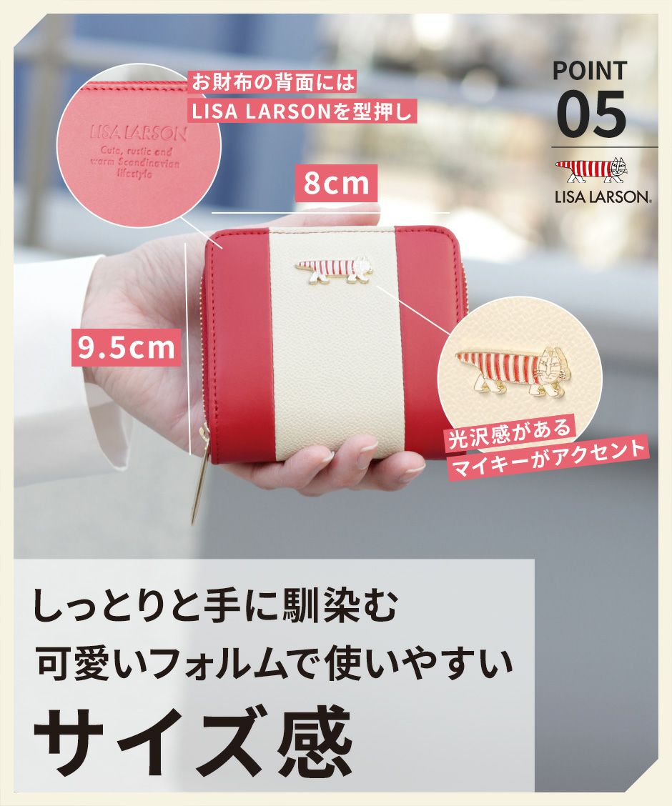 世界中で愛される北欧ブランド“LISA LARSON(リサ・ラーソン)”から、シンプル・エレガントな大人のお財布シリーズが新登場。 上質な牛革を使用し、プレーン×シボ型押しの2種類のレザーでバイカラーに仕上げました。 ちょこんと乗った“マイキー”のプレートは、一点ずつハンドメイドにより仕上げた細やかな作り。 きらりと輝くチャームプレートが、立体的で可愛らしいアクセントになっています。 LTLY-05はファスナー小銭入れの付いた二つ折りタイプ。小銭入れの内側はマチ付き・2層式。コンパクトなのにしっかりと収納可能です。 リサ・ラーソンのロゴ入り化粧箱付きで、プレゼントにもおすすめです。