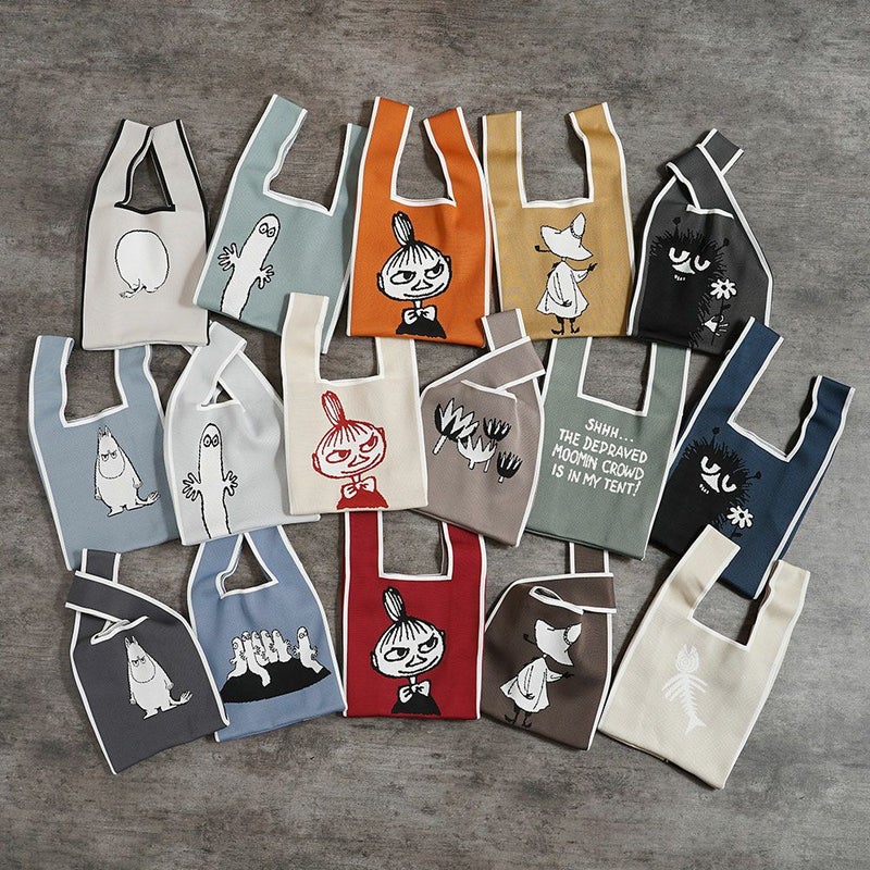 背面の柄も魅力的 ムーミン:後ろ姿 / リトルミイ:お花 / スナフキン:コミックから抜き出したセリフ / ニョロニョロ:複数のニョロニョロ / スティンキー:魚の骨