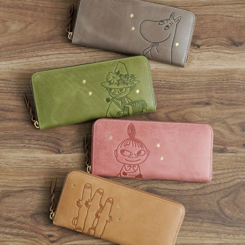 ムーミン、リトルミイ、スナフキン、ニョロニョロ が 各カラーごとに 大きく 型押しされた 大人可愛い お財布。
