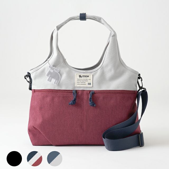 持ち手がくり手のかわいい、コロンとしたフォルムの鞄です。 機能性にもすぐれていてハンドバッグとショルダーの2way仕様。 荷物が重い日はショルダーで持ち歩けます。 メイン収納部分にはあおりポケットがあり、 ファスナーとオープンの2層構造で、14Lと大容量でたっぷり入ります。 取り出しに便利なポケットが前面に2つ、後ろに1つと、外側に3つあるので よく使う小物をすっきり収納できるのもおすすめポイント。 持ち手をまとめるボタンのロゴの刻印や mozのオリジナルワッペンなど、シンプルな鞄にもこだわりのデザイン。 お弁当や水筒、ノート、A4書類も入る 通勤やデイリーユースに使いやすい2wayバッグです。