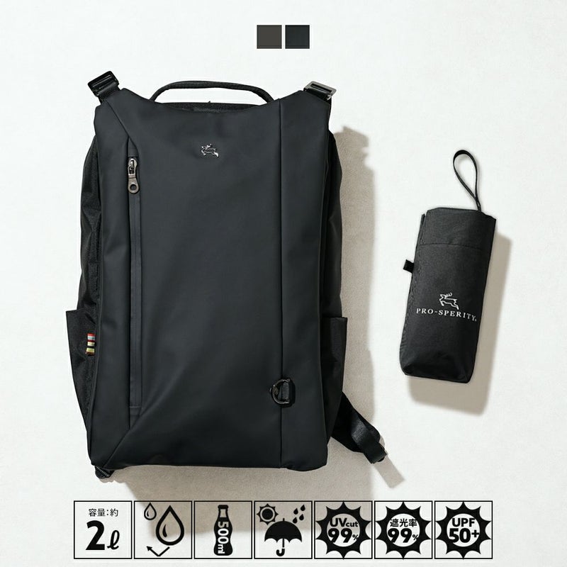 晴雨兼用 の オリジナル 折りたたみ傘 を 付属し、防水性 に 優れた 素材 と 止水ファスナー を 採用した 2層式 リュックサック。