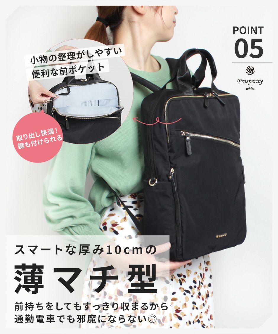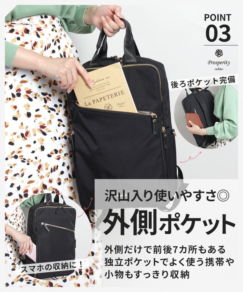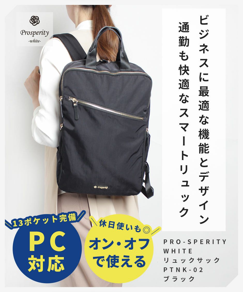 Prosperity white(プロスペリティホワイト)PTNK-02は、デザイン性、機能性を持ち合わせたビジネスに大活躍するリュックサックです。 バッグ本体の生地には、しわ加工をしたナイロン生地を採用。汚れが目立ちにくく、ビジネスはもちろん休日使いでも使えるデザイン。 また、収納に便利なポケットの数が13個も完備!PC収納に便利なクッション材ポケットや小物収納に便利なポケットも完備しているので、 荷物の整理や取り出しがスマートに◎持ち手や付属のパーツには牛革を使用しているので品の良い見た目となっています。