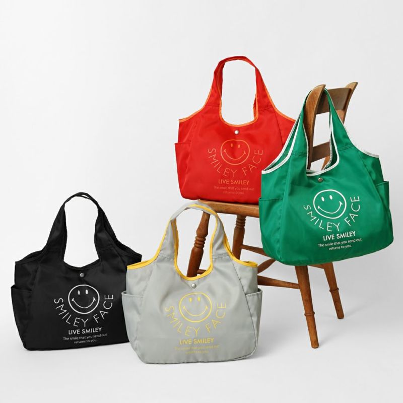 スマイリーフェイスのプリント 大きなニコニコマークが目を惹くプリント。ユニセックスで使用できるカジュアルなトートバッグです。