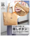 サイズ (W)(上)43/(下)33×(H)35×(D)9cm 容量 (上辺まで) 約20リットル (ボタンを留めた状態) 約14リットル 重量 約 550g 仕様 [外側] ・オープンポケット×5 [内側] ・オープンポケット×1 ・仕切りあり(3仕切り) 素材 [本体]高品質 綿ツイル、[付属]ヌメ革 カラー アイボリー(白、オフホワイト)、ブラック(黒)、レッド(赤)、ベージュ