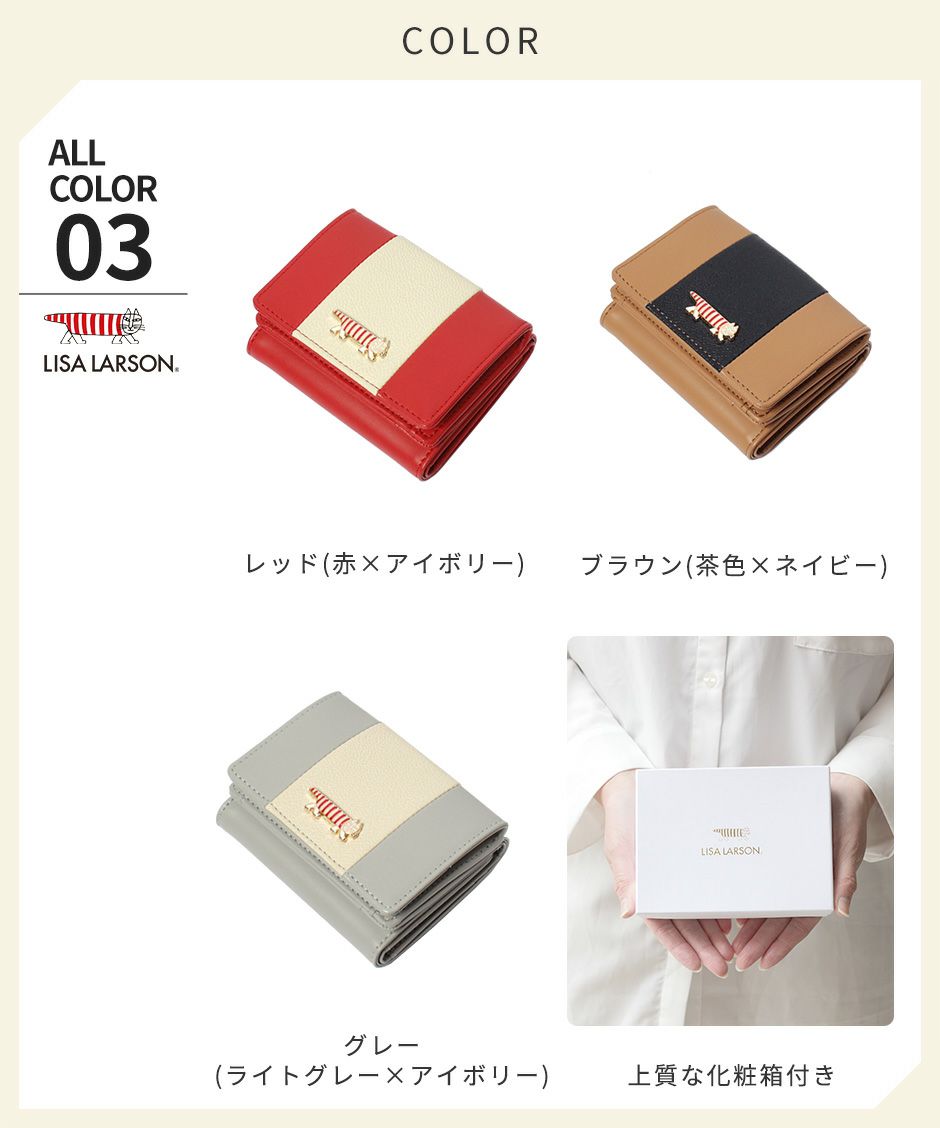 世界中で愛される北欧ブランド“LISA LARSON(リサ・ラーソン)”から、シンプル・エレガントな大人のお財布シリーズが新登場。 上質な牛革を使用し、プレーン×シボ型押しの2種類のレザーでバイカラーに仕上げました。 ちょこんと乗った“マイキー”のプレートは、一点ずつハンドメイドにより仕上げた細やかな作り。 きらりと輝くチャームプレートが、立体的で可愛らしいアクセントになっています。 LTLY-04は手のひらサイズ・三つ折りタイプのミニ財布。スナップ式の小銭入れや、札入れ、カードポケットなど小さくてもしっかりと収納が可能です。 リサ・ラーソンのロゴ入り化粧箱付きで、プレゼントにもおすすめです。