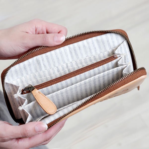 内側は使いやすい2ルーム式になっていて、お札の種別管理・レシートの収納にも便利な設計。中央に設置された小銭入れはファスナー式で、小銭がこぼれる心配も無用です。素材には牛革を使用し、しっとりと手に馴染む柔らかで使う毎に愛着のわく質感です。内側を布地にすることで、見た目とは裏腹の軽量さを実現。裏地はストライプ柄で明るく中身が見やすいデザインになっています。